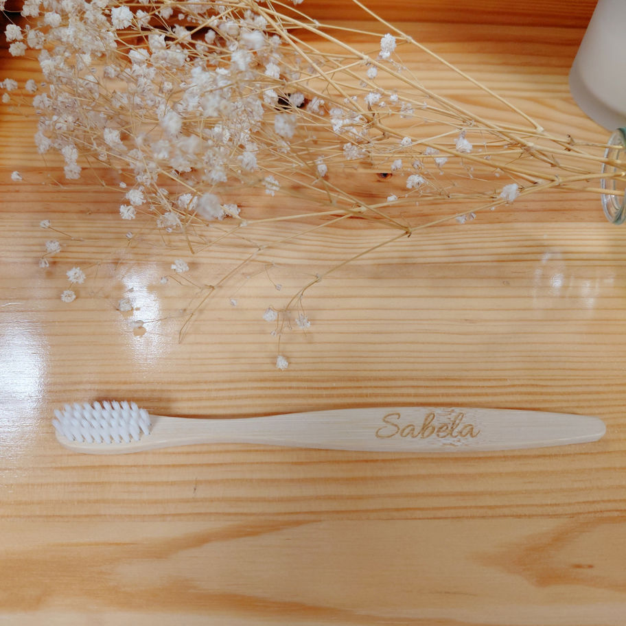 Cepillo dental personalizado con el nombre de cada invitado, línea ECO fabricando en bambú, con cerdas de plástico blanco.