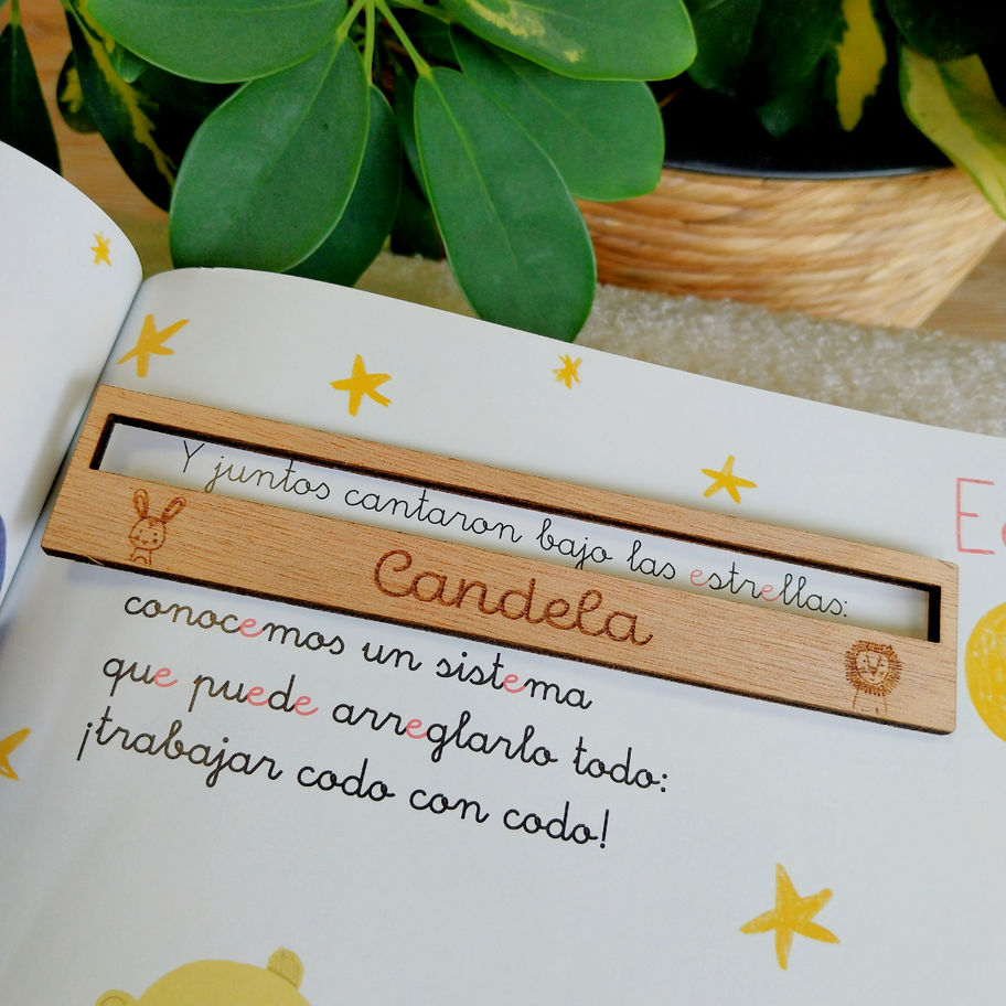 Regla de lectura en madera para ayudar a la lectura de los mas peques , personalizada al 100% con nombre y el dibujo de un conejo y león.