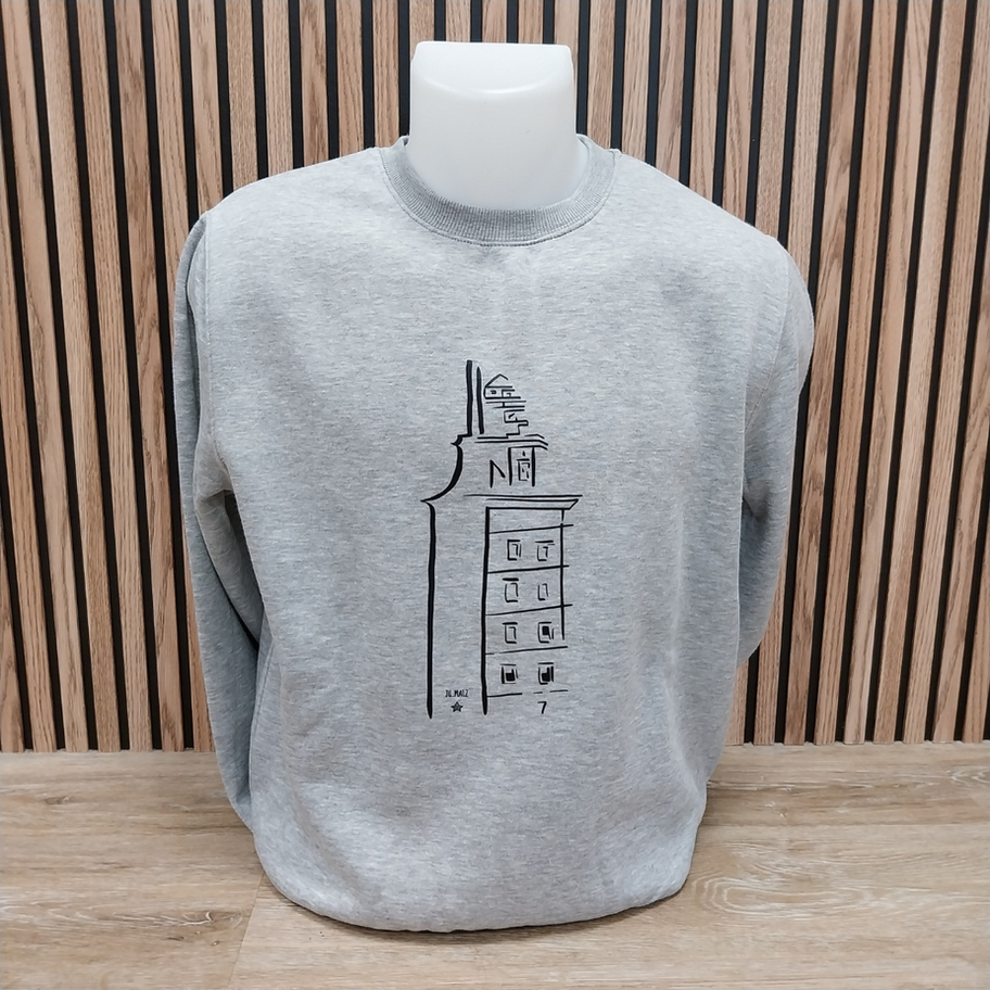 Sudadera gris con cuello redondo con la imagen de la "TORRE DE HÉRCULES"